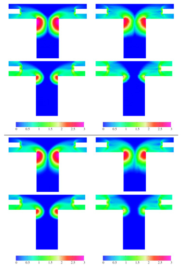 T-shape domain, FV(BR), FV(DA) (top) and FV-DG(BR), FV-DG(DA) (bottom). Density distribution obtained on the finest meshes at time s.