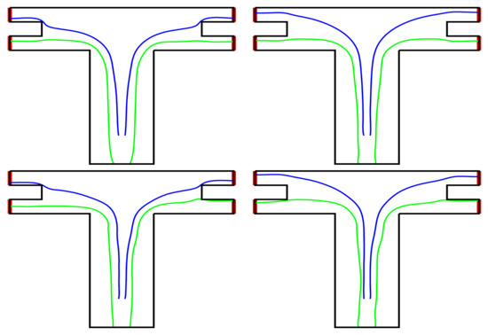 T-shape domain pedestrian trajectories. First row FV in order Bornemann-Rasch algorithm and Dijkstra’s algorithm, second row FV-DG method in the same order. Pedestrian trajectories for starting position (blue color) and , respectively (green color). The pedestrians starting at cross the line at time s and reach the more distant exit at time s. The pedestrians starting at cross the line at time s and reach the nearer exit at time s.