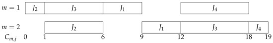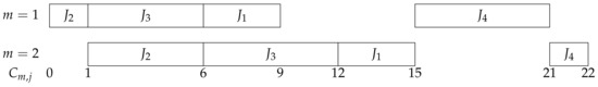 Figure 1 shows an optimal permutation solution with = 22, and Figure 2 shows an optimal non-permutation solution with = 19. Both of them are feasible. In this example, it is clear that the non-permutation solution can attain a better makespan than the permutation one.