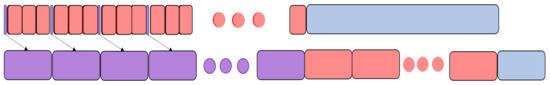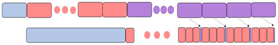 We first note that job 1 should start first on machine 1 for otherwise non-zero idle time will be incurred on machine 2. After completing job 1 on machine 1, the resource level drops from to B. To start the next enforcer job 2, machine 1 wait for the previous enforcer job 1 to be completed to accumulate sufficient resources. To avoid the idle time between the first and second enforcer jobs on machine 1, we assign ordinary jobs to fill up the idle period. Let be the set of elements defining these ordinary jobs. If , then there is an idle time before job 2 on machine 1. On the other hand, if , then the resource is insufficient and the completion time of some ordinary jobs are later than the second enforcer job, leading to the idle time on machine two. As the result, must hold. Continuing this process, we can find subsets with , , satisfied for the 3-Partition problem. Figure 3 shows the sequence of the optimal schedule: the purple blocks are enforcer jobs, the red ones are ordinary jobs, and the blue ones are final job. □