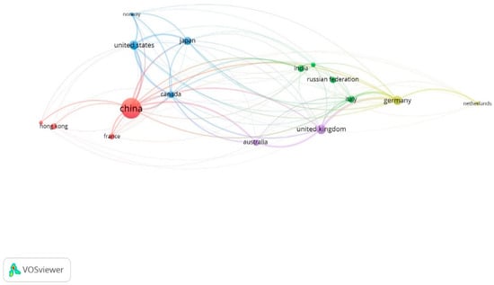 The findings of the bibliometric coupling are depicted in Figure 1. Each circle represents a nation, and its size indicates the contribution, as follows: the larger the dot, the more outstanding the contribution. China is the world’s most productive nation (consistent with Table 2). Further, China has the strongest bibliometric ties to other countries, followed by the United Kingdom and the United States.