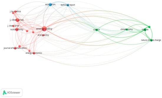 The co-citation analysis of these top journals is an intriguing component of the bibliometric study. Co-citation happens when two papers from two distinct journals are cited jointly by a third document. For example, Figure 3 shows that the Energy Policy has the strongest co-citations amongst all of the journals, followed by the Journal of Cleaner Production and Sustainability. These facts show that the journals presented in Table 4 share similar literature, and that is why they have strong co-citations.