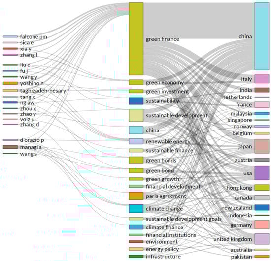 To determine the author’s area of specialization in green finance, we conducted a three-field plot analysis. This study establishes a link between authors and the keywords they included in their green finance papers. In Figure 4, the authors’ names are listed on the left, the keywords used in the green finance paper are listed in the middle, and the authors’ countries are shown on the right. We may easily deduce the author’s field of study from the direction of the links. For example, Liu C mainly used green finance, green economy, and sustainable development as keywords, so his research mainly concerns green economic problems in sustainable development from a financial perspective. Similarly, Ng A.W. mainly wrote on green finance, sustainability, and green bonds, which indicates his research was specific to green bond instruments.
