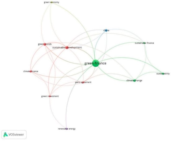 This section analyses the content further, in terms of keywords, which is a valuable tool for locating relevant literature and trends. In this phase of the investigation, VOSviewer software is used to discuss the co-occurrence of the authors’ keywords to explain the features of publications in green finance, and the results are displayed in Figure 5. Note that the keywords analyzed here are based on the text content of keywords in papers. Also, the co-occurrence implies the frequency that a keyword appears with other keywords. In this research, keyword analyses are utilized to find trends in the subjects examined.