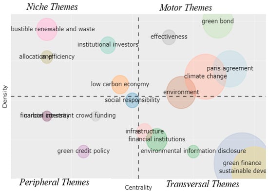 To draw a thematic map (Figure 6) of the keywords of green finance, we used the Biblioshiny package of RStudio, with a minimum frequency of five per thousand words. This technique helps to map the main themes of the journal. Based on the suggestion proposed by Cobo et al. [], this strategic map plotted the main themes into four quadrants, according to their density and centrality ranks along the X and Y axes. Centrality is a measure of the interaction of a network with other networks, and it is the measure of the importance of theme in the whole research; in this case, green finance []. In comparison, density identifies the degree of development of themes based on the internal strengths of the network.
