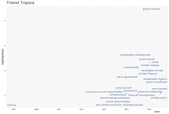 In addition to the keyword co-occurrence analysis, it is also of great interest to understand the popularity of different topics and themes during the past 15 years, from the time window. On the one hand, from Figure 7, we can see that during the early years of green finance publication (2005–2014), finance was the only area of research in the journal. On the other hand, from 2015 to 2018, research on corporate social responsibility, green growth, low-carbon economy, and sustainability, which studies environment protections from an economic perspective, has been in fashion. Until 2019, green finance, green bonds, and green investment became independent topics amongst researchers.