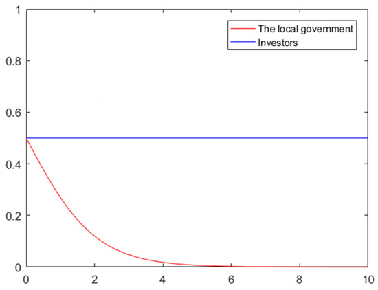 On this basis, this article uses MATLAB software to simulate the uncertain evolution of the housing bubble under the multi-dimensional market sentiment based on the background that China announced the construction of the Free Trade Pilot Zone and the Free Trade Port in Hainan province with Chinese characteristics on 13 April 2018. Based on the time series of the housing bubble evolution, the development and evolution of the housing bubble in Hainan province are divided into five stages: the bubble-free stage (before 13 April), the bubble germination stage (13 April), the bubble formation stage (14 April–21 April), the bubble inflation stage (14 April–21 April), and the bubble burst stage (22 April). According to the evolution results of different stages, we put forward corresponding prevention and regulation strategies. The simulation results are shown in Figure 2, Figure 3, Figure 4, Figure 5 and Figure 6, where the horizontal axis represents the evolution time, the simulation period is set as 10, and the vertical axis represents the probability of game players’ strategy selection, which evolves in the range of 0 to 1. The initial probability is assumed , which means that the local government and investors both choose between different strategies with an initial probability of 0.5, and the values of related parameters are strictly limited within the bounds.