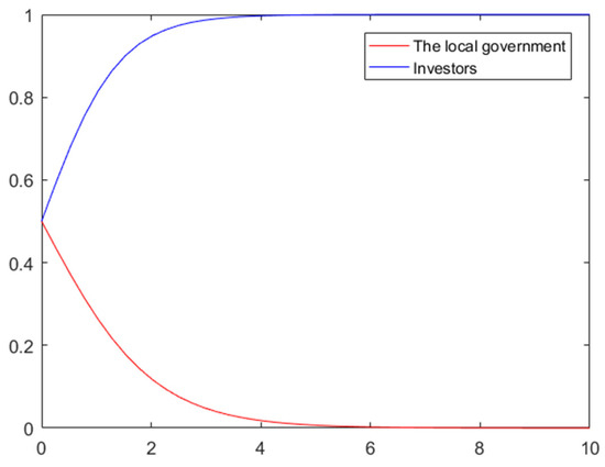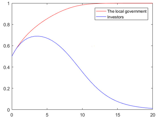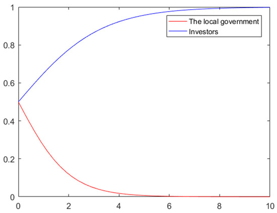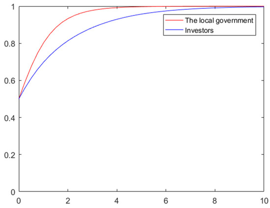 Equation (7) shows that the change rate of probability of the local government’s choice of “regulation” is proportional to the probability of local government’s choice of “regulation” and the probability of “no regulation”, and is also proportional to the payment difference between “regulation” and “no regulation”. In addition, it is also related to the value of , but not to the rate of change of .