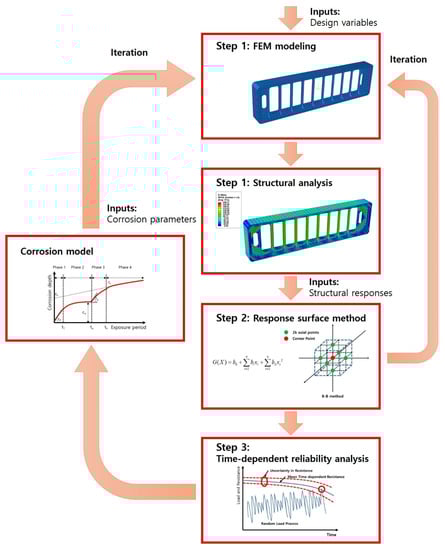 The final Step 3 is the process of performing time-dependent reliability analysis with corrosion. This is a process to find the reliability index of plate-stiffened prismatic pressure vessel using the FEM model and limit state function produced in Step 1 and Step 2. The structure reliability analysis over time was conducted to observe the changes in the reliability index values over time. Corrosion was reflected for the thickness of the plate used for the design and fabrication of the structure, and a time-dependent limit state function was derived by reflecting the effect of corrosion on the FEM model, and structural reliability analysis was conducted by utilizing it. To analyze the structural reliability, the previous Step 1 and 2 are repeated, and the process proceeds until the values of the reliability index of the entire structure converge. In the model, the effects of corrosion are continuously updated, and the updated limit state function production and structural reliability analysis are repeatedly performed.