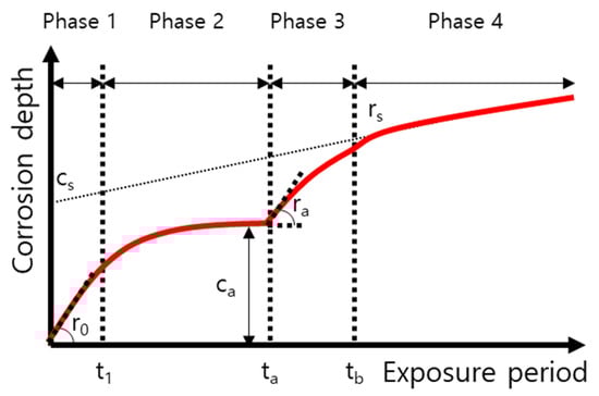 Several empirical models have been proposed for general and pitting corrosion. In this study, the corrosion model proposed by Melchers [19,23,27,28] was used, and the parameters in Figure 2 and Table 1 were used to focus on long-term corrosion.
