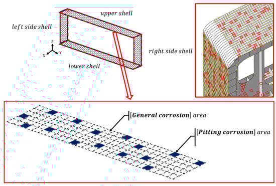 To reflect the effect of corrosion over time in modeling, the outer shell thickness was changed. The outer shell was divided into areas where general corrosion and pitting corrosion occurred, and each area was subtracted from the initial design thickness by the corrosion depth according to the change in time. In this study, the corrosion depth was calculated by applying temperature, T = 15 °C to the Melchers’ general and pitting corrosion model described in Section 2.
