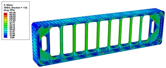 Figure 6 shows the results of FEM analysis. After fabricating and analyzing the strip model for the plate-stiffened prismatic pressure vessel, it was confirmed that the stress value was 167.5 MPa, which was an extremely low value compared with the allowable strength of the material, i.e., 230 MPa. Based on the results of structural analysis, it can be concluded that prismatic pressure vessels are safe.
