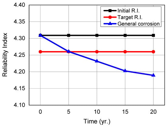 When general corrosion occurred on the outer shell, the resulting graph according to the change over time is as shown in Figure 7; it was confirmed that the following values representing general corrosion were applicable for 5, 10, 15, and 20 y. After 5 y, the reliability index value was 4.261, which was almost the same as the initial target reliability index. As the lifetime increased, the effect of corrosion gradually increased, and the reliability index declined to 4.189 after 20 y. The corrosion depth at 5 and 20 y was 0.41 and 1.26 mm, respectively. After 20 y., it was confirmed that a corrosion thickness of 0.8 mm or more was required to satisfy the target reliability index.