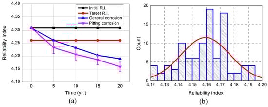 Results of structural reliability analysis with pitting corrosion; (a) reliability index; (b) distribution of reliability index.