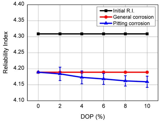 Next, we analyzed the effect of changes in the reliability index of the structure according to the change in the DOP. The DOP was changed at 2% intervals from 0 to 10%, and the reliability index changes according to the DOP are shown in Figure 9. The reliability of the initial structure and the effect of pitting corrosion owing to DOP change after 20 y were compared. Until 2% in DOP change, the reliability index change was not affected significantly. At 4% DOP change, the reliability index value when pitting corrosion was applied was within or outside the standard deviation compared with that of general corrosion, and it was within the error range. As the DOP increased by 4%, the value of the reliability index decreased as the value of the DOP increased. Hence, it was confirmed that when the DOP due to the corrosion depth occurred owing to the actual pitting corrosion, the reliability of the structure was affected.
