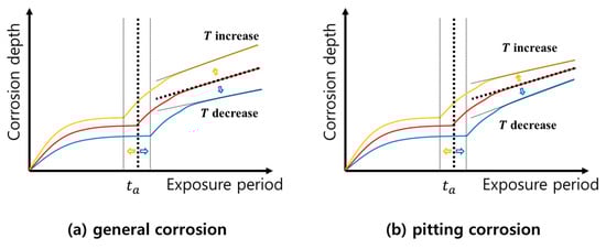 According to the Melchers model, in the case of general corrosion, the higher the temperature, the deeper the corrosion depth. At 15 °C, corrosion showed a linear change in thickness in the long-term region for 5, 10, 15, and 20 y of service time to be compared. However, as the temperature increases, the corrosion graph shows that the graph moves to the left as a whole, as shown in Figure 10a. The occurrence of deeper corrosion depth could be confirmed even after a little time. On the contrary, when the temperature was lowered, the graph moved to the right, confirming that the overall corrosion depth was reduced.