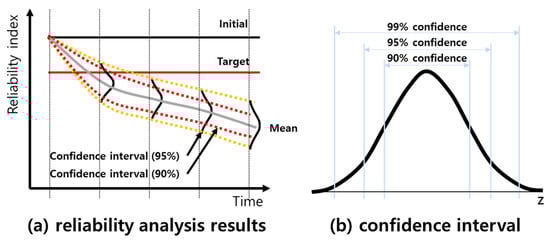 Reliability refers to the ability of a structure to perform the required function under a certain condition when no breakdown or damage occurs, and it can be expressed as shown in Equation (1) when the probability of failure is . Failure probability values are calculated for various failure modes, and the sum of the probability is used to obtain the maximum reliability value of the structure. The reliability index represents the value of Z in the standard normal distribution when evaluating the reliability of probability, and the failure probability can be obtained using the inverse function of the cumulative distribution function.