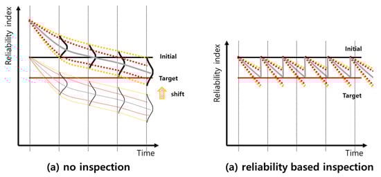 The structure deteriorates over time and the material strength changes accordingly; therefore, the probability distribution depends on time and must be evaluated. Time dependence may result from a decrease in structural capacity or failure resulting from the occurrence of loads above the structural strength or loading capacity. This time-related structural reliability analysis is called time-dependent reliability analysis. In other words, the reliability index of the structure will fluctuate over time, and whether the structure is safe for the designed lifetime should be determined. Hence, a time-related term is added to the limit state function and transformed into a limit state function in Equation (3). If the load and resistance change over time, and the change in load over time is higher than the resistance or strength of the structure over time, i.e., , structure failure will occur. In general, in time-dependent reliability, corrosion and fatigue progress primarily because they change over time.