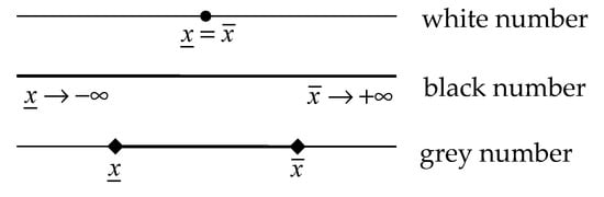The Grey Systems Theory is an effective methodology that can be used for solving uncertain problems with partially known information [47]. The basic concept of this theory is that all information is classified into three categories, depending on their uncertainty, and the appropriate colors are assigned to them as follows—known information is labeled as white, unknown information is labeled as black, and the uncertainty information is labeled grey. The white, black and grey numbers are shown on Figure 1.