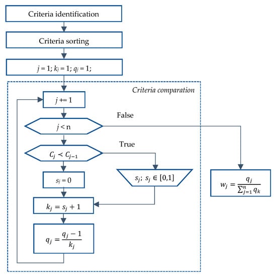 The calculation procedure of the SWARA method, for determining the criteria weights, is summarized in Figure 2.