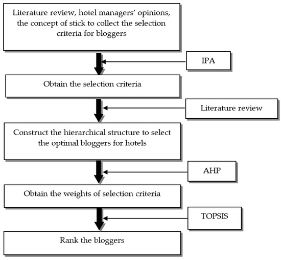 This study presents an innovative mixed MCDM model including IPA, AHP, and TOPSIS to assist hotel managers in selecting bloggers. We firstly collect the selection criteria via interviews with hotel managers and a review of the literature on blogger selection and the stick concept. Based on IPA and the literature review, a hierarchical structure for blogger selection is constructed. Then, AHP and TOPSIS are integrated to assist the hotel managers in selecting bloggers. IPA, AHP, and TOPSIS are described as follows. The selection procedure is illustrated in Figure 1.