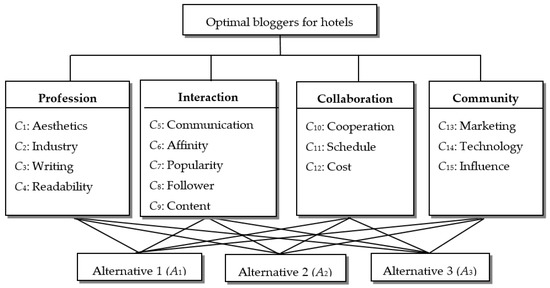 TOPSIS is user-friendly, as decision makers may directly input information without prior mathematical computation. Moreover, it can also be integrated with other MCDM approaches [53]. In this paper, the weights of the selection criteria obtained from AHP are imported into TOPSIS for selecting optimal bloggers for hotels.