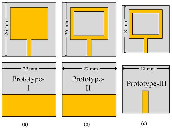To move the resonance frequency back to 3.5 GHz, the dimensions of the antenna are optimized. After a detailed parametric study, optimum dimensions are used in the Prototype-III, which are shown in Figure 2c. The Prototype-III resonates at 3.5 GHz. It can be seen from Figure 2a–c that this prototype has a physical area of 324 mm2, which is 44% smaller compared to the conventional monopole antenna that has an area of 572 mm2.
