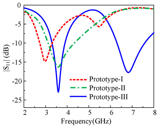 The simulated reflection coefficient of three different prototypes for the proposed antenna design.