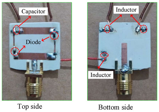 Usually, antennas can be analyzed using the full-wave method or approximation method based on simplifying assumptions. In full-wave, electromagnetic solutions include all the possible electromagnetic solutions within a boundary condition. In contrast, the approximation method cannot consider surface waves and mutual coupling since it does not enforce boundary conditions. Various software solutions for antenna design, including a comparison of packages, tools, techniques, and algorithms for different design challenges, have been reported thoroughly [20]. For broadband results in high frequencies, full-wave time-domain methods are more accurate. For accurate characterization of the proposed antenna, we modeled 3D structure of the antenna, and its impedance and radiation characteristics are computed by employing finite-integration time-domain electromagnetic simulator CST. We chose a transient time-domain solver with a hexahedral mesh type was selected with an accuracy level of −40 dB. The PIN diodes were realized using its equivalent lump lumped elements. Furthermore, to minimize the connector’s effect on antenna performance, commercially available SMA is modeled and used at the antenna feed for numerical analysis. The equivalent electrical model of the PIN-diode utilized for simulation is presented in Figure 4. For the ON-state, the PIN-diode behaves like a series combination of inductor and resistor. While for OFF-state, the diode acts like a series combination of an inductor with a parallel combination of resistor and capacitor, as depicted in Figure 4 a,b, respectively. For ease of understanding, OFF-state is represented by ‘0’ while diode On-state is meant by ‘1’. Figure 5 illustrates the fabricated prototype of the proposed antenna utilized for measurement purposes. Vector Network Analyzer (VNA) having model no. E5063A with a range of 500 MHz to 18 GHz, by Keysight Tech., was utilized to measure the return loss of the proposed work. A broadband horn antenna (1–18 GHz) was used for the measurements of far-field parameters, which means radiation patterns and gain.