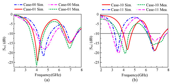 The comparison between measured and simulated reflection coefficient for various switching cases; (a) Case-00, Case-01 (b) Case-10, Case-11.