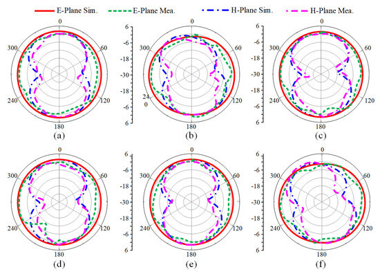 Figure 7a–f depicts the comparison among predicted and measured radiation patterns at the various frequencies. The antenna exhibits an omnidirectional radiation pattern in principle E-plane for lower passband frequencies, while a slightly distorted omnidirectional radiation pattern was observed for higher passband frequencies, as depicted in Figure 7b,f. Regarding principle H-plane , the antenna exhibits an 8-shaped bidirectional radiation pattern for all selected resonating frequencies. is observed in E-plane. In general, a good agreement was observed between simulated and measured results for all selected frequencies, as depicted in Figure 7.