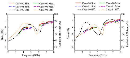 Figure 6 presents the comparison of the magnitude of the proposed antenna’s reflection coefficient for various switching states. For case-00, the antenna resonates at two frequencies of 4.6 GHz and 7.2 GHz with respective predicted bandwidth of 1020 MHz and 840 MHz, as depicted in Figure 6a, while the measured values show the impedance bandwidth of 1390 MHz and 1010 MHz for resonating frequency of 4 GHz and 6.85 GHz, respectively. It could also be seen from Figure 6a that for case-01, the antenna resonates at 4.1 GHz and 7 GHz with respective impedance bandwidths of 760 MHz and 1090 MHz. On the other, the measured value shows the resonating frequencies of 4 GHz and 6.85 GHz having individual bandwidth of 870 MHz and 1210 MHz, as depicted in Figure 6a.