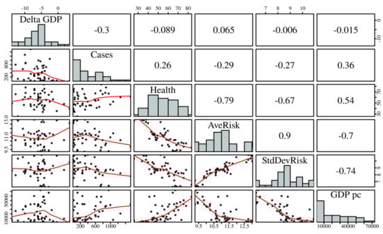 A descriptive summary of the data considered in this research is presented in Table 3, where the linear relationship of the variables is shown in Figure 1. Pearson correlations of the indicated variables are in the upper triangular of this figure; the corresponding scatter plots are in its lower triangular; and the histograms of each variable are in its diagonal. As displayed in Figure 1, we detected possible correlations among the response ΔGDP% and the covariates: Cases, Health, RiskAve, and RiskStdDev, which justified the use of multiple linear regression models. Nevertheless, when analyzing the existing correlations between the covariates of the model, we suspected possible multicollinearity. Thus, to assess collinearity based on Model 3 with constant variance specified in Section 2.4, we calculated the variance inflation factors (VIF) given by: and . Note that the variance of the estimated coefficient of log (RiskAve) is inflated by a factor of 8.24, making it the largest one. This indicates that log (RiskAve) is correlated with some of the covariates of the model. However, large VIF values, that is, greater than 10, suggest a multicollinearity problem as mentioned in p. 200 of [36] and in [37]. Therefore, no collinearity problems were detected in our case study.
