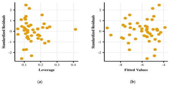 Plots of leverage (a) and fitted values (b) versus standardized residuals.