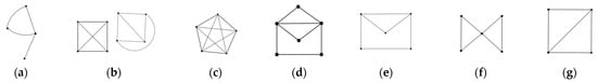 Basic graphs. Examples of (a) graph; (b) planar graph; (c) nonplanar graph; (d) Eulerian graph; (e) non-Eulerian graph; (f) Eulerian graph, but non-Hamiltonian graph; (g) Hamiltonian graph, non-Eulerian graph.