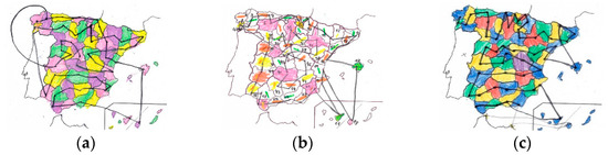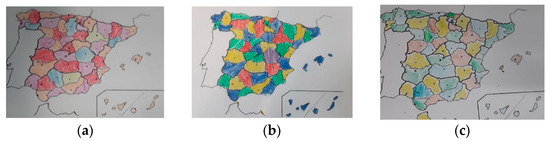 First attempt of coloring the map of Spain. Drawing made by participant: (a) A3; (b) A6; (c) A4.