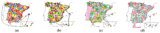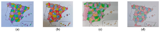 First attempt of coloring the map of Spain. Drawing made by participant: (a) A1; (b) A2 (orange is yellow); (c) A5; (d) A7.