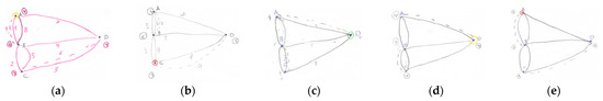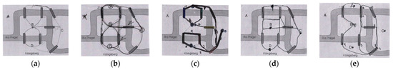 Köningsberg bridges. Drawing made by participant: (a) A7; (b) A6; (c) A5; (d) A3; (e) A4.