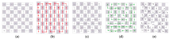 Chess routes. Drawing made by participant: (a) A5 using a rook; (b) A3 using a rook; (c) A7 using the queen; (d) A4 using a rook; (e) A6 using the king.