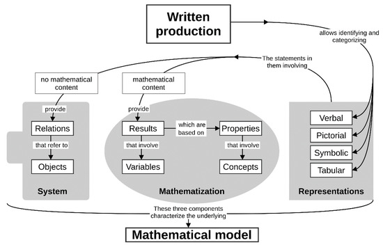The tool for the analysis of school models explained in this paper is based on three components: system, mathematization and representations. Previous research highlights that the wide variety of contexts in which modeling can take place makes it difficult to establish a priori criteria to discriminate and specify the complexity of entities that may be present in the system [12] and in the mathematization [31]. The tool presented in this paper proposes criteria for organizing the elements within each category, thus facilitating the analysis of written productions. Within the system and the mathematization, the proposal takes up the ideas of [12,30,32] to distinguish between statements (relations and results in the system and properties in the mathematization) and terms to which these statements refer to (objects and variables in the system and concepts in the mathematization). Furthermore, in line with the proposals of [12,25], the question that motivates the modeling activity or any other questions that arise about the starting context are considered to be part of the system, and therefore, part of the model, since these questions largely determine the final outcome of the modeling.