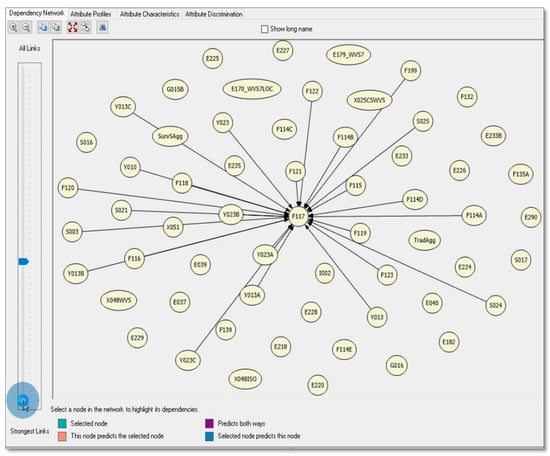 After running the Naive Bayes algorithm, a dependency network has been obtained (Figure 1). Using a slider operating from the strongest to all links, the latter suggests the best predictors identified under the assumption of their independence, which will be subjected to further tests in Stata, responsible for eliminating redundant variables.