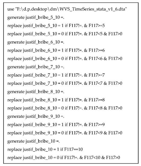 - Cross-validations using the mixed-effects technique (melogit—variables to select from as fixed effects) and checks of significance loss using the value of p—it was additionally considered the significance level of 1‰ starting from the fact that in large samples, p-values tend to decrease quickly to zero [27] when considering six binary forms (derived also in Stata) of the dependent variable (F117—Table 1 and Table 2) and four criteria (random effects): wave, country, sex, and age;