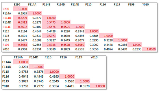 After consecutively checking the correlation matrices when starting from this set of 10 remaining input variables (top of Figure 3—issues for correlation coefficients larger than 0.5 as absolute value), some intercorrelated ones have been eliminated when considering additional criteria. For instance, the accuracy one (Area under the Curve of the Receiver Operating Characteristics—AUCROC) for Logit models with just one predictor and an alternate binary outcome for F117 (justif_bribe_6_10). For instance, when considering F114D vs. E290 (AUCROC of 0.8099 for 157,239 observations vs. 0.7818 for 67,532). The same (first) for F114D vs. F114E, the first was kept (AUCROC of 0.8099 for 157,239 observations vs. 0.7863 for 66,517). At this point, only eight possible predictors remained, by eliminating E290 and F114E.