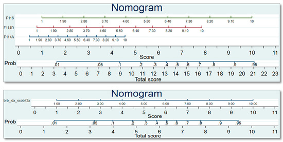 In terms of further validations using Zlotnik and Abraira’s prediction nomograms [32] based on Logit regressions (Table 7, models 3 and 4 with excellent accuracy of classification—AUCROC = 0.9169), two such visual outputs have been generated. The first one (top of Figure 5) corresponds to the original model with those three predictors (positive influences) and clearly shows that as the respondents’ attitudes towards cheating taxes (F116), violence against other people (F114D), and accepting government benefits not entitled (F114A) are more permissive, the risk of accepting bribes increases. The second (bottom of Figure 5) is based on the model having the index as the only predictor (also positive influence). Moreover, in terms of maximum theoretical probability (Zlotnik and Abraira’s nomolog [32] for Logit regressions—Table 7, models 3 vs. 4) that corresponds to the most favorable value or combination of values of the predictors, it seems that there is no loss. Actually, in both cases, the score (value of 10) or the sum of scores (about 22.2) indicates a maximum probability with a value slightly above the 95% threshold.