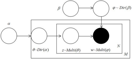 Clustering is an unsupervised learning method. In 2003, Blei et al. [39] proposed the Latent Dirichlet Allocation (LDA) topic model which is mainly used for semantic analysis of text data. As a generative statistical model, LDA extracts latent topics by summarizing keywords of a document, and these topics represent the main content of the entire document. The structure of the LDA model is shown in Figure 3, where is the topic distribution of document , is the th word in document , is a specific word, is the number of documents, is the number of words in the document, and represents the distribution parameter of the topic on the word, represents the distribution parameter of the word, and represents the polynomial distribution function of the word. is the parameter of the multinomial distribution of words in the topic.
