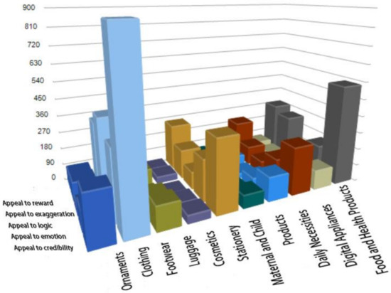 From a horizontal perspective, that is, to analyze the frequency of linguistic style usage from the perspective of various commodity categories, it is not difficult to find that, for all ten categories of commodity, the linguistic persuasive style of appealing to personality is used for the largest proportion. For product categories of cosmetics, stationery, maternal and child, household goods, digital appliances, and food and health products, the frequency of linguistic persuasive style of appealing to reward ranks the second; for product categories of clothing and luggage and bags, the use of the linguistic style of appealing to exaggeration ranks second. However, the linguistic persuasive style of appealing to reward is used more frequently in the product categories of shoes and accessories, which shows that for these two categories, consumers pay more attention to the actual benefits of the products, that is, spiritual returns and physical returns. For different product categories, the use of logical persuasion style is the least. The five linguistic persuasive styles are subdivided into tags, as shown in Table A1 in the Appendix A.