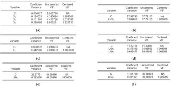VIF test results of Models. (a) VIF test results of Model 7; (b) VIF test results of Model 8; (c) VIF test results of Model 9; (d) VIF test results of Model 10; (e) VIF test results of Model 11; (f) VIF test results of Model 12.