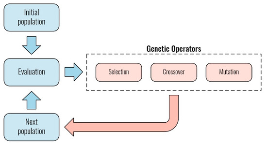 In general, a genetic algorithm is structured in a three-step iterative process [31]: (i) an initial population of solutions (individuals) is created, represented by a chromosome that encodes the solution to the problem; (ii) a group of individuals is selected through a specific strategy, based on the fitness function, and the next population is generated by applying genetic operators (crossover and mutation) to the selected individuals; (iii) step (ii) is repeated until the remaining individuals in the generation are good enough according to the fitness function and the stop criteria. This process is outlined in Figure 1.