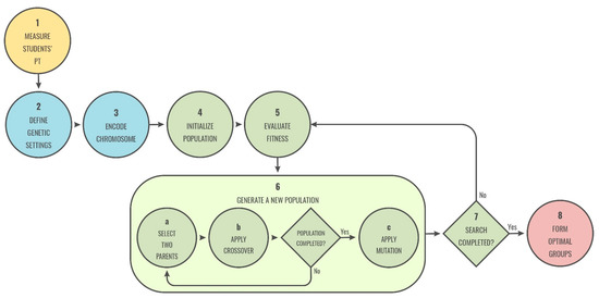 Figure 2 illustrates the main flow of the student group formation process, using the proposed genetic algorithm, grouping the different steps into four stages: input (1), GA settings preparation (2, 3), GA procedure (4, 5, 6, 7), and output (8).