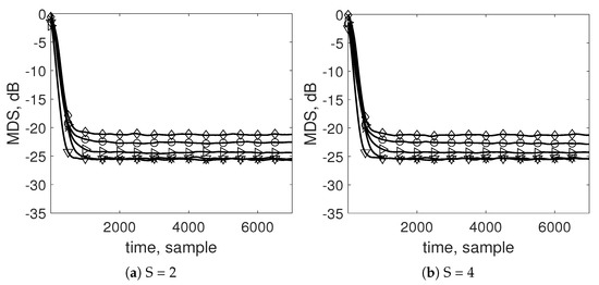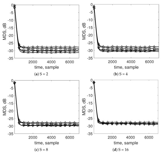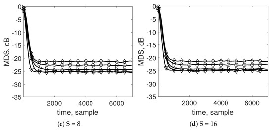 For the simulation in this section, we set the same experimental conditions as in [13] (code is available at https://web.itu.edu.tr/eksioglue/pubs.htm accessed on 16 March 2021). We assume two system parameters, , with N = 64 taps and 256 taps, respectively. Out of the N coefficients, the only S coefficients are not zero. We generate the values of coefficients from an N(0, 1/S) distribution and randomly place the non-zero coefficients.